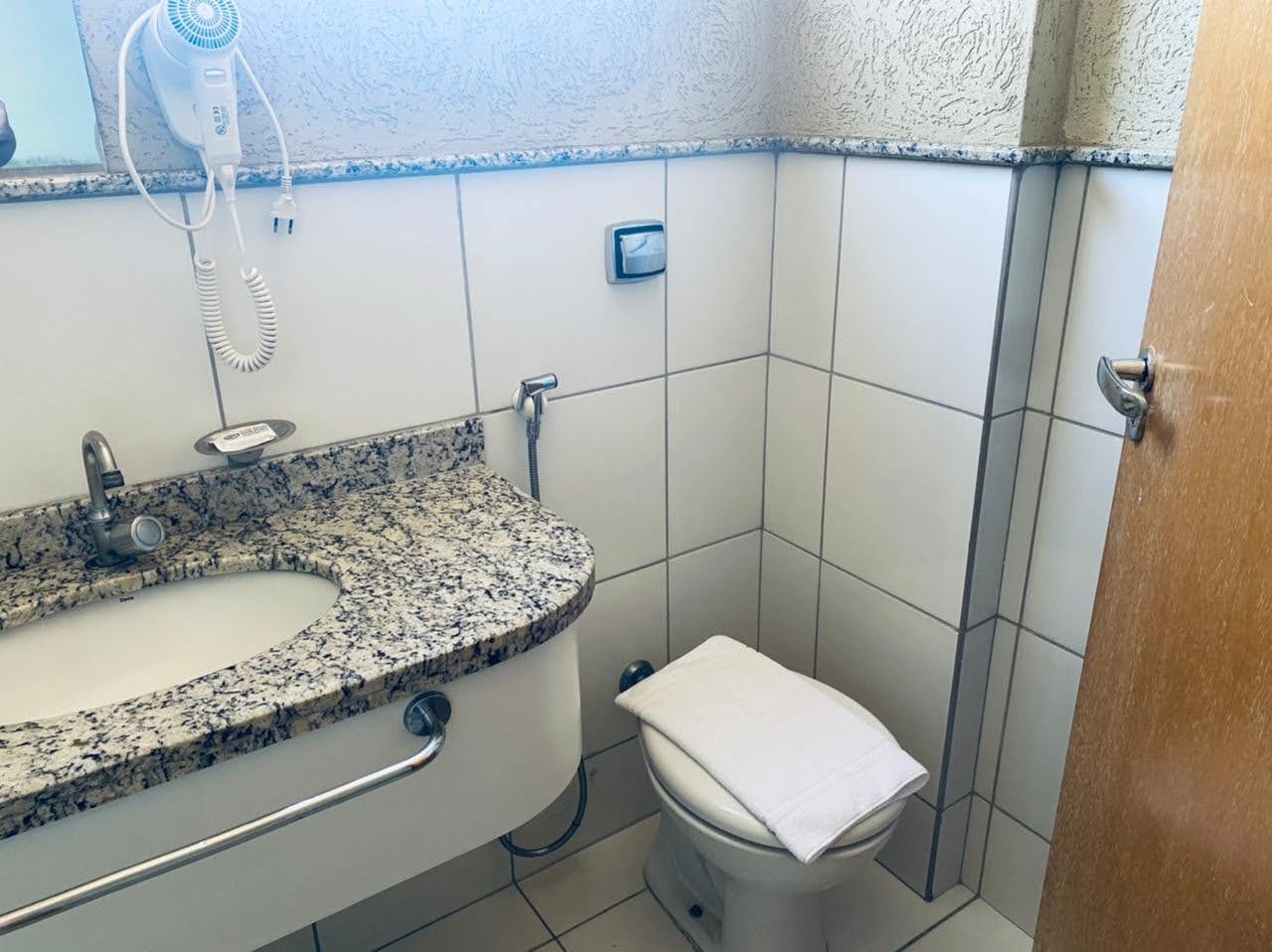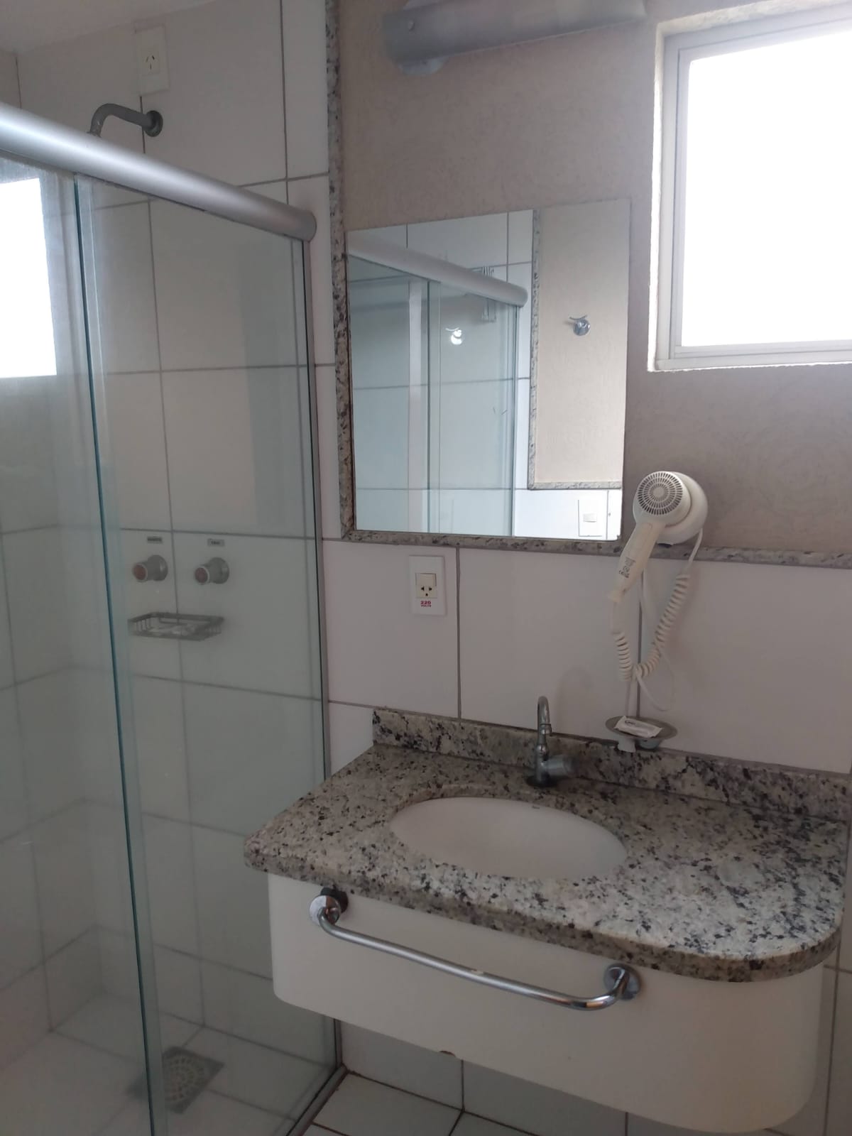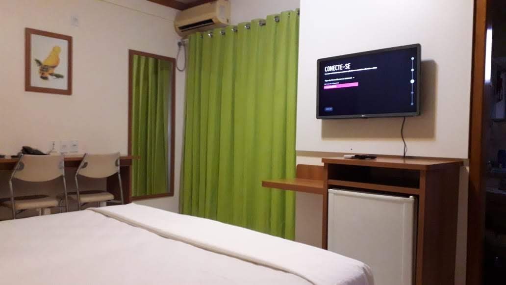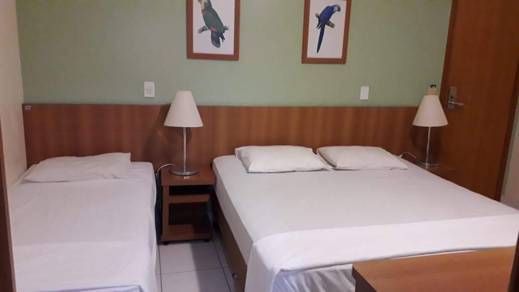 Apartamento tipo suítecom varanda contem, uma cama de casal, uma cama de solteiro, frigobar, ar condicionado, cortinas, mesa com duas cadeiras.